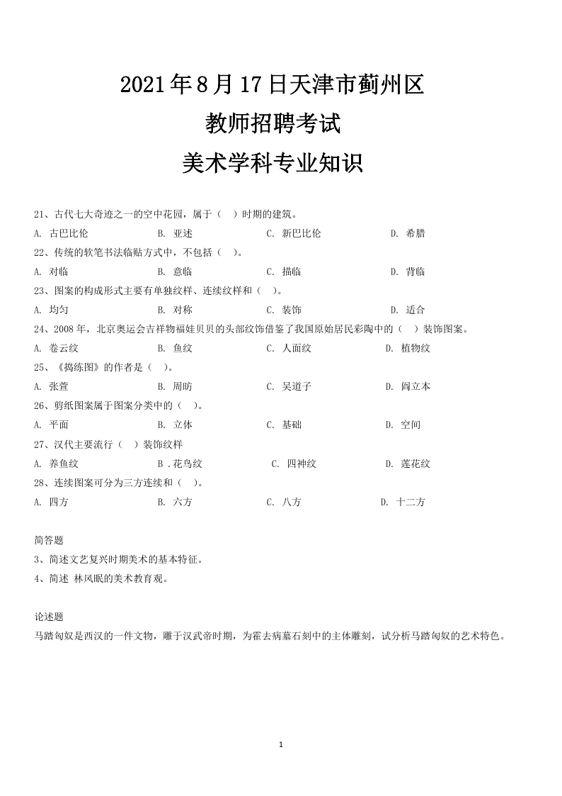 2021年天津市蓟州区教师招聘考试美术部分试题及答案解析