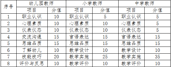 中小学教师资格考试(面试)满分100分,各项目分值具体如下(中职教师面试分值同中学教师):