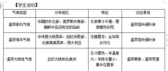 学生通过观察“世界气候类型分布图”得出主要有:温带季风气候、温带海洋气候、温带大陆性气候。
