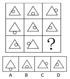 每一行均由三个三角形与三个小球组成,且圆形出现在三角形内部两次,出现在三角形外部一次,则排除a、c选项,同时圆形出现在三角形三个边各一次,排除d选项
